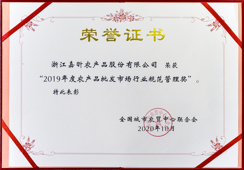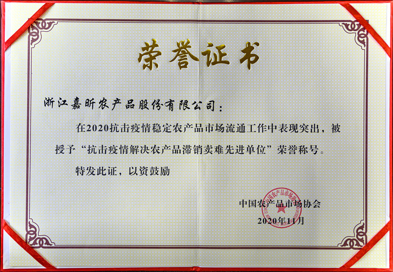 浙江嘉昕農(nóng)產(chǎn)品股份有限公司(其前身為嘉興市蔬菜食品有限公司),是國家級(jí)服務(wù)業(yè)標(biāo)準(zhǔn)化試點(diǎn)(商貿(mào)流通專項(xiàng))第一批典型經(jīng)驗(yàn)案例推廣企業(yè)并成功通過項(xiàng)目驗(yàn)收,是全國商業(yè)質(zhì)量品牌示范單位、全國誠信興商雙優(yōu)示范單位、企業(yè)信用等級(jí)AAA級(jí)企業(yè),是省農(nóng)產(chǎn)品流通龍頭企業(yè)、省骨干農(nóng)業(yè)龍頭企業(yè)、省重點(diǎn)流通企業(yè),省先進(jìn)基層黨組織企業(yè)、省專業(yè)市場(chǎng)黨建示范點(diǎn)企業(yè)、省防控新冠疫情市場(chǎng)保供貢獻(xiàn)突出企業(yè)、省商貿(mào)流通標(biāo)準(zhǔn)化良好行為示范企業(yè),市先進(jìn)黨組織企業(yè)、市抗擊新冠肺炎疫情先進(jìn)集體企業(yè)、市十佳農(nóng)業(yè)龍頭企業(yè)、市服務(wù)業(yè)領(lǐng)軍型企業(yè)、市先進(jìn)集體、市文明單位、市和諧勞動(dòng)關(guān)系先進(jìn)企業(yè),區(qū)高質(zhì)量發(fā)展十強(qiáng)服務(wù)業(yè)企業(yè)、區(qū)十強(qiáng)納稅服務(wù)業(yè)企業(yè),是市政府“菜籃子”工程主要實(shí)施單位之一。