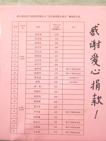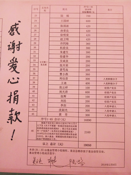為繼續(xù)做好新一年度愛心基金工作,公司黨總支從2月5日-12日期間開展了2018年度公司“黨員慈善愛心基金”捐贈工作,得到了全體黨員、入黨積極分子、黨員經營戶和入黨申請人的熱烈響應,黨總支屠書記率先獻愛心,共有45位同志踴躍捐款共計16890元,連同開發(fā)區(qū)下拔的結對困難戶慰問資金2160元,總計19050元匯入公司“黨員慈善愛心基金”池,開展2018年度向困難戶等扶弱濟困慰問工作。