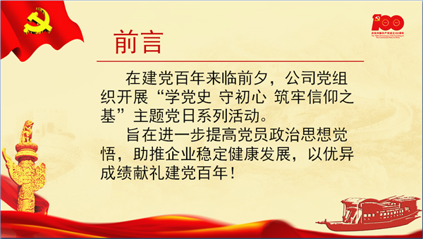我公司黨總支《學(xué)黨史 守初心 筑牢信仰之基》主題黨日活動(dòng)的內(nèi)容,既符合規(guī)定的程序要求,又結(jié)合本企業(yè)實(shí)際隔入了以“微型黨課”撰寫和交流、黨建共建等提升教育特色、以“紅船旁的黨員承諾卡”等形式增強(qiáng)管理特色等內(nèi)容,通過活動(dòng)切實(shí)激發(fā)了黨員同志們帶頭發(fā)揮先鋒作用。